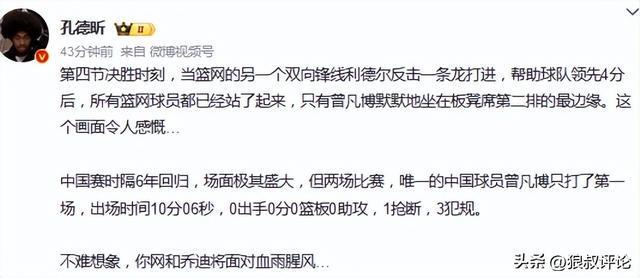 中国赛时隔6年回归,场面极其盛大,但两场比赛,唯一的中国球员曾凡博只打了第一场,出场时间10分06秒,0出手0分0篮板0助攻,1抢断,3犯规。
