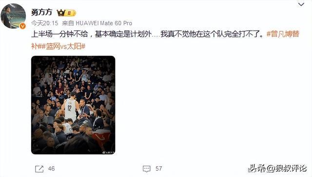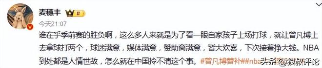 媒体人三土带刺发文表示:对于NBA中国赛来说,未必有那么多人想来看曾凡博,但一定有为他而来的,特别是一些首钢的球迷!