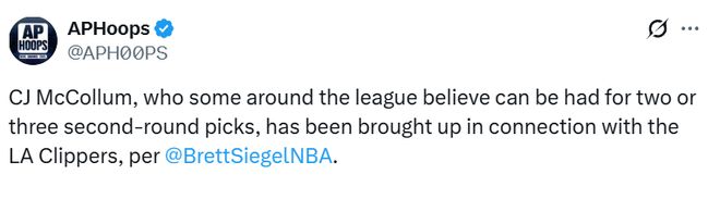 北京时间12月24日, 据名记Siegel报道,奇才的34岁后卫CJ-麦科勒姆吸引联盟多支球队关注,他的名字已经和洛杉矶快船队联系在了一起。